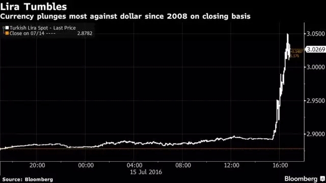 土耳其軍方宣布政變推翻現(xiàn)政府后,土耳其里拉下跌4.6%,跌至1美元兌3.0157里拉,創(chuàng)下自2008年來(lái)最大單日跌幅。