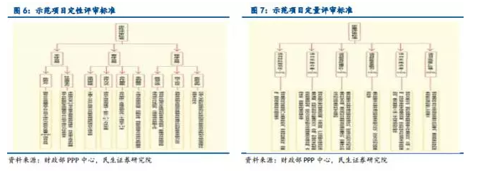 財政部示范項目由各省財政部門推薦,財政部組織專家評審選出的,項目質(zhì)量最有保障,操作最為規(guī)范。示范項目的評審標準十分嚴格,分為定性評審和定量評審兩部分:定性評審主要審查項目的合規(guī)性,包括主體合規(guī)、客體合規(guī)、程序合規(guī)三部分;定量評審是通過設(shè)定指標和權(quán)重綜合評估項目的示范性。具體的評審細則如圖所示: