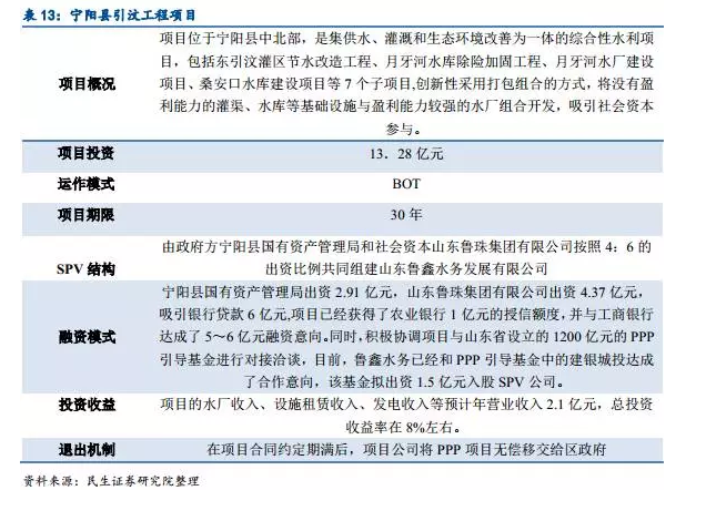 2015年5月,發(fā)改委、財政部、水利部等三部門印發(fā)《國家層面聯(lián)系的社會資本參與重大水利工程建設(shè)運營第一批試點工作方案》,篩選出12個試點項目,確加快推進項目前期工作、加大項目投資支持力度、創(chuàng)新項目產(chǎn)品定價機制等試點支持政策,推進PPP模式在水利工程中的應(yīng)用。