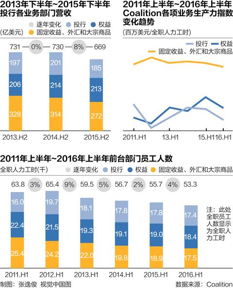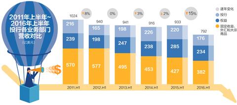 包括股票和債券交易、并購咨詢業(yè)務(wù)以及融資等在內(nèi),這些大投行今年上半年的各項營收總額為792億美元,遠低于2015年上半年的933億美元,相較于2009年上半年投行的營收頂峰1400億美元,則跌了將近一半。