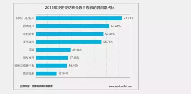 而后隨著影片推向市場,通過購票網(wǎng)站評分、觀眾評論、社交媒體傳播、人際傳播等多方面的交互影響,對后續(xù)觀眾是否愿意購票觀看將起著主要作用(根據(jù)偉德福思數(shù)據(jù)2015年觀眾研究報告:網(wǎng)絡(luò)口碑和影評已成為決定觀眾觀影選片的首要因素)。