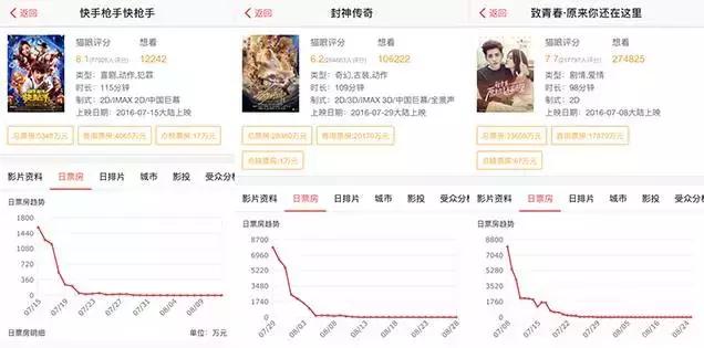 通過第三季度主力影片的票房曲線可看出,除了個別影片外,幾乎都成瀑布狀沒有起伏一路下瀉,所以觀察君給它取了個名字叫“瀑布曲線”。
