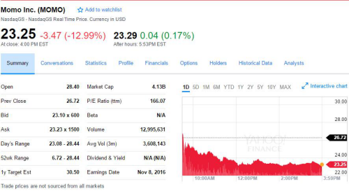 陌陌發(fā)布第三季度財(cái)報(bào)當(dāng)天,股價一路下滑近13%,跌破其50日均線