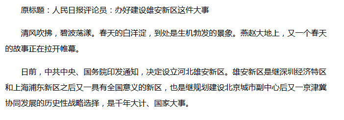 據(jù)新華社報道,日前,中共中央、國務院印發(fā)通知,決定設立河北雄安新區(qū)。這是繼深圳經(jīng)濟特區(qū)和上海浦東新區(qū)之后又一具有全國意義的新區(qū),也是深入推進京津冀協(xié)同發(fā)展的一項重大決策部署,是千年大計、國家大事。