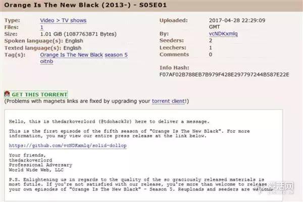 就在一周前,由于Netfilx拒付“贖金”,黑客們把Netflix計劃于6月9日上線的熱播美劇《女子監(jiān)獄》第五季的前10集發(fā)布到了Pirate Bay(世界最大的BT種子網(wǎng)站)上,而好萊塢幾大經(jīng)紀公司UTA,ICM和 WME,也同樣遭到黑客的勒索,2014年好萊塢“艷照門”事件重演似乎也一觸即發(fā)。