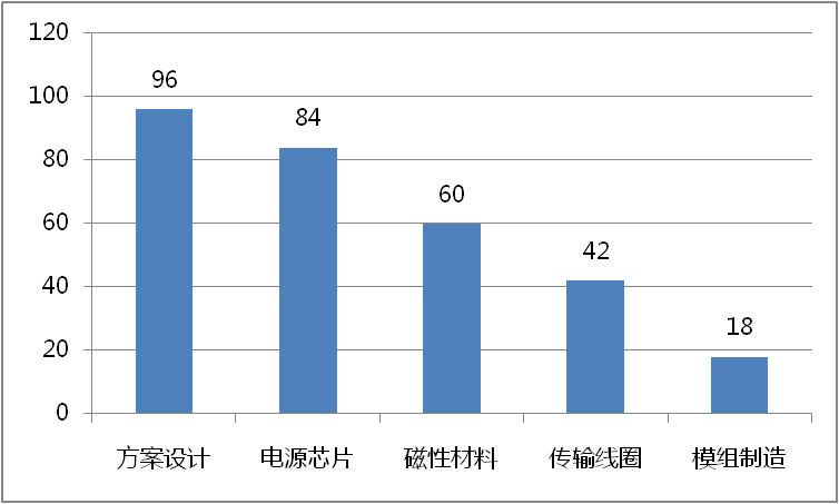 雖然無線充電技術(shù)是以不同終端產(chǎn)品的形態(tài)展現(xiàn)在消費(fèi)者面前,但其實(shí)無線充電功能的實(shí)現(xiàn)包含多個(gè)技術(shù)點(diǎn),即其產(chǎn)業(yè)鏈包含多個(gè)環(huán)節(jié)。大致來講,無線充電產(chǎn)業(yè)鏈從上游到下游,包括以下五個(gè)環(huán)節(jié):電源芯片、磁性材料、傳輸線圈、模組制造、方案設(shè)計(jì)。其中方案設(shè)計(jì)和電源芯片環(huán)節(jié)技術(shù)壁壘高、利潤高(大概各占無線充電產(chǎn)業(yè)鏈利潤的30%),基本被國外企業(yè)壟斷。磁性材料和傳輸線圈環(huán)節(jié)技術(shù)壁壘相對較低,同時(shí)擁有中外玩家,利潤占比各為20%和14%。模組制造環(huán)節(jié)技術(shù)壁壘和利潤最低,主要參與者為國內(nèi)廠商,廠商利潤占比僅為6%。
