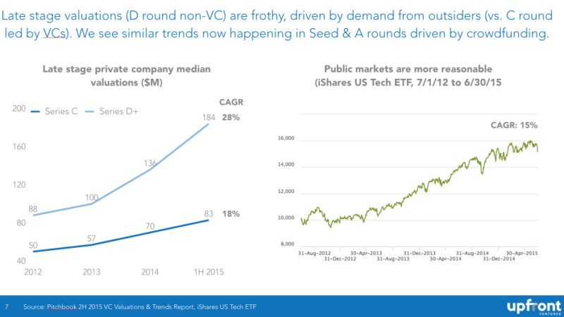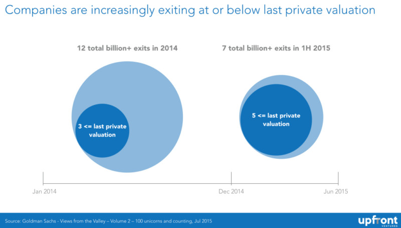 通常而言,市場(chǎng)總會(huì)帶來一些提示。2014 年,12 次估值中就有 3 次比上一輪估值要低。25% 的 down round(后一輪估值比上一輪低的融資輪次)比例著實(shí)可悲??墒堑搅?2015 年,down round 的比例高達(dá) 71%,7 次估值中就有 5 次比上一輪估值要低。
