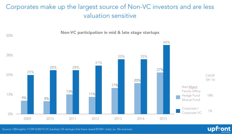 當(dāng)你開始深挖次級(jí)獨(dú)角獸俱樂部成員猛增的幕后推手時(shí),就能發(fā)現(xiàn)這些推波助瀾資本的一些來源。資本來源之一就是來自企業(yè)投資者,包括谷歌、樂天(日本最大的網(wǎng)絡(luò)零售商)、阿里巴巴、康卡斯特等。這些企業(yè)投資者增加了風(fēng)險(xiǎn)投資的比例,但在利潤(rùn)動(dòng)機(jī)上與傳統(tǒng)投資者有顯著不同,企業(yè)投資者的風(fēng)投行為往往是出于定價(jià)動(dòng)機(jī)。這并非是與企業(yè)投資者劃清界限,筆者只是強(qiáng)調(diào)出于戰(zhàn)略投資的考慮,企業(yè)投資者的投資行為往往會(huì)超出純粹的金融投資者的理解范圍。