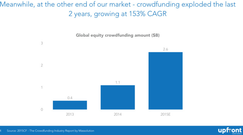 如果不承認(rèn)眾籌在創(chuàng)業(yè)公司中所扮演的重要角色,那就無法準(zhǔn)確地討論 2016 年風(fēng)險(xiǎn)投資行業(yè)的愿景及展望。在過往的兩年中,我們看到有大量的科技創(chuàng)業(yè)公司通過眾籌平臺(tái)獲得資金。同樣在過往的兩年中,眾多新興眾籌平臺(tái)如雨后春筍般在全球各地涌現(xiàn),眾籌的金額也水漲船高,從兩年前的 4 億美元暴漲至 26 億美元。