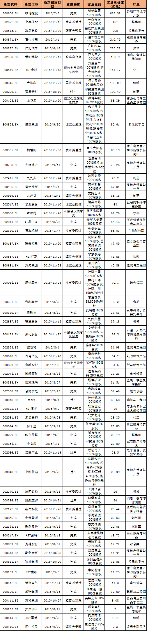 綠地集團(tuán)是今年A股最大借殼上市的成功案例。綠地集團(tuán)是中國(guó)最大的混合所有制房企,2014年金豐投資公布的相關(guān)重組方案,擬通過(guò)資產(chǎn)置換和發(fā)行股份購(gòu)買資產(chǎn)方式重組,注入綠地集團(tuán)100%股權(quán),交易總價(jià)為667.32億元。今年7月份,金豐投資披露完成重大資產(chǎn)重組,同時(shí)正式將公司名稱變更為“綠地控股股份有限公司”。變更登記完成后,綠地控股成為綠地集團(tuán)的惟一股東,綠地集團(tuán)成為旗下全資子公司。