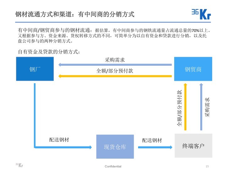 鋼鐵流通屬于資金密集型行業(yè)。鋼廠以收取部分或全部的預(yù)收款后發(fā)貨的銷售方式為主,而鋼鐵的終端用戶存在賒賬采購(gòu)的需求,在有鋼貿(mào)商 / 中間商參與的交易中,鋼貿(mào)商起到墊資的功能,而資金來(lái)源主要為銀行信貸。公開(kāi)數(shù)據(jù)表明鋼貿(mào)商財(cái)務(wù)成本高達(dá) 15%-25%。