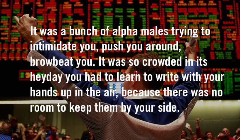 DA:在場內(nèi)交易鼎盛的時候,人頭攢動,你都沒法找到地方寫東西,隔空寫字也是一門學(xué)問。此外,場內(nèi)交易所里大男子主義四處彌漫,而這些人會經(jīng)常會嘗試恫嚇或者欺侮你。